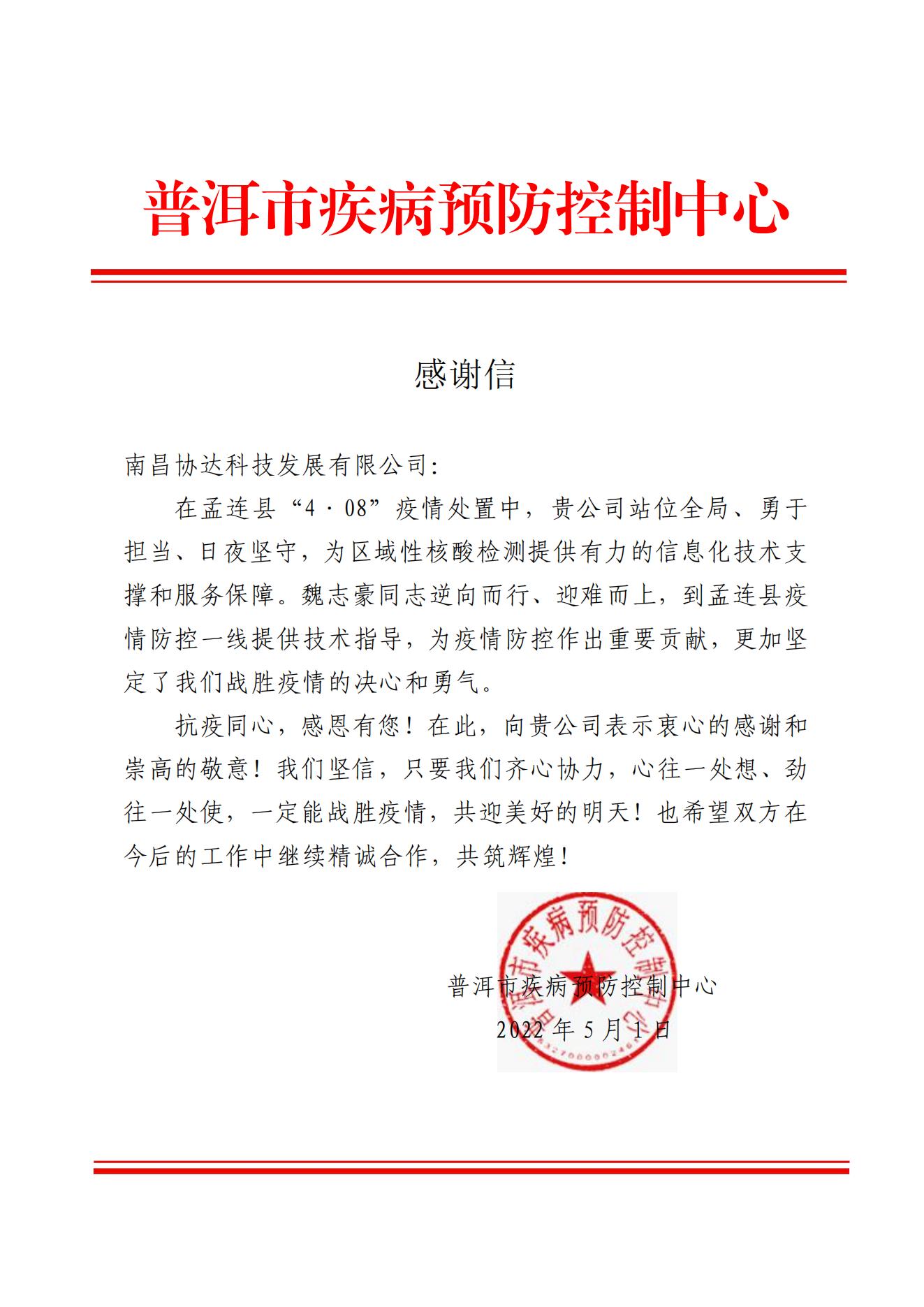 普洱市疾控中心感謝信! ——向協(xié)達科技助力孟連疫情處置的現(xiàn)場同事致敬!